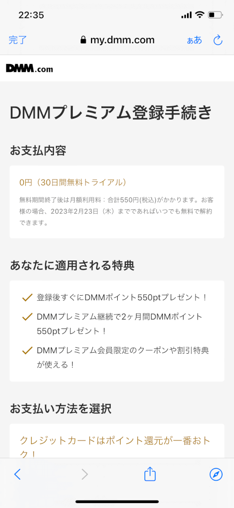 なお先述しましたが、登録時に「DMMポイント支払い」を選択した場合は、無料トライアルの対象外となります。