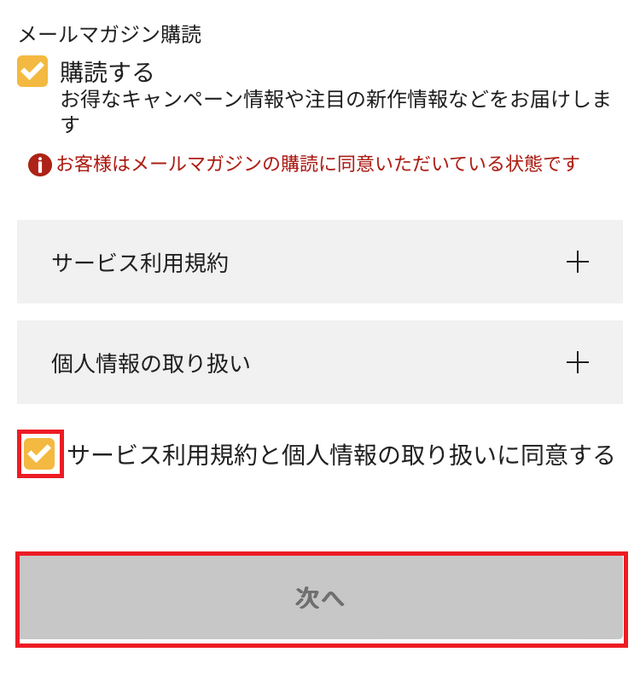 各項目の入力が完了したら、「サービス利用規約と個人情報の取り扱いに同意する」にチェックを入れ、「次へ」をタップします