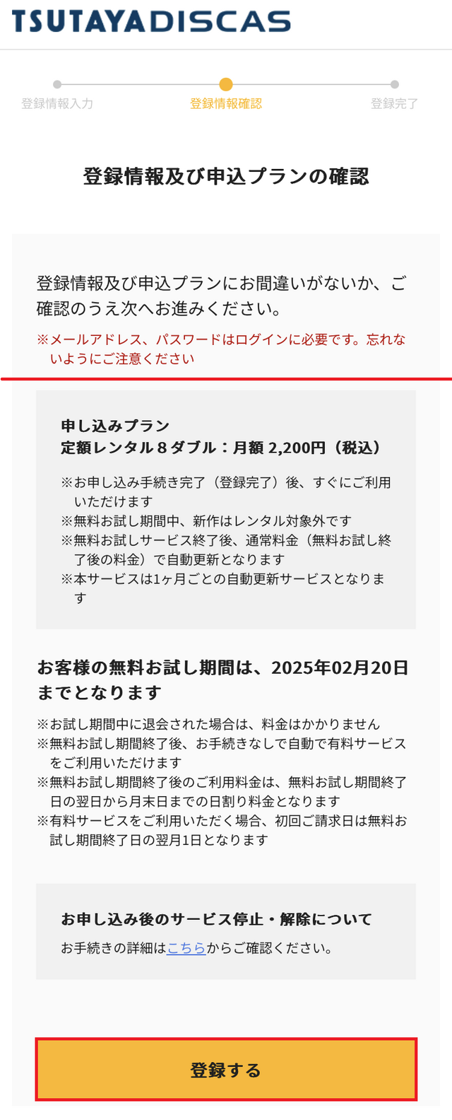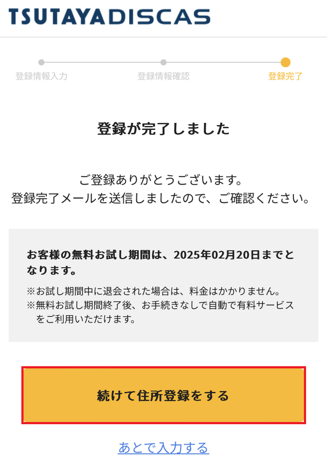 TSUTAYA DISCASの利用を開始するには、最初にメールアドレスを認証する必要があります。