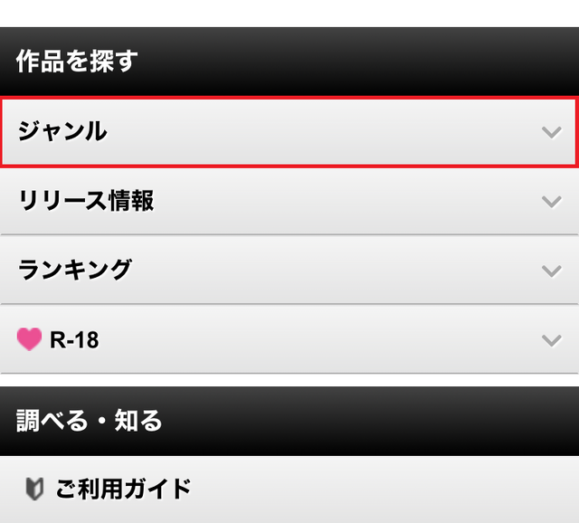 TSUTAYA DISCASトップページの下にメニューが表示されているので、「ジャンル」をタップしましょう。