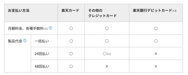 楽天モバイルで機種変更する場合は24回払いと48回払いの分割払いに対応しています。ただし、「デビットカード」でのお支払いは端末代の分割払いに対応していません。