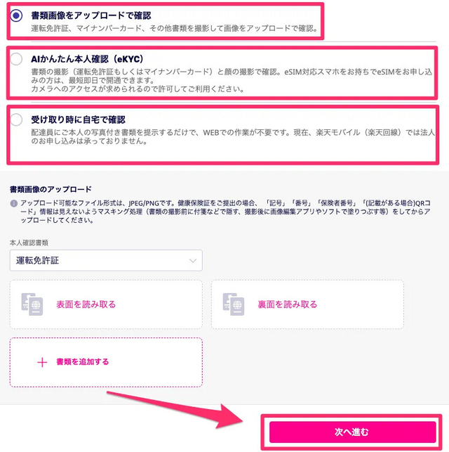 プランを選択したら「本人確認書類」を提示していきます。