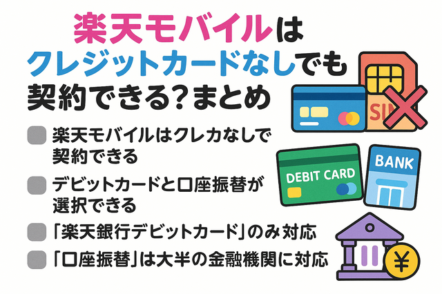 楽天モバイルをクレジットカードなし契約できるかについてまとめると以下なります。