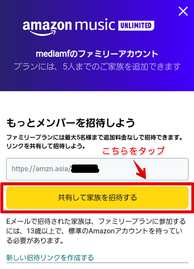 そして「家族を管理する」という項目をクリックすると、招待URLが掲載されたページに移行するので、招待したい相手にURLを送付すれば完了です。