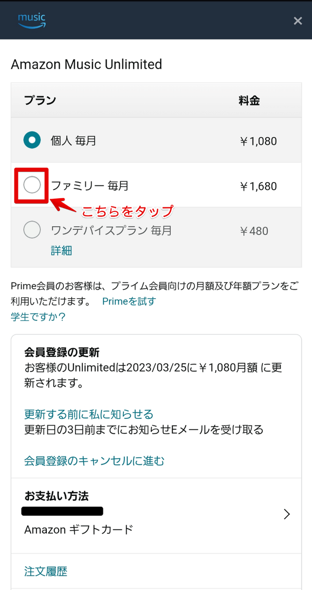 Prime会員の場合は、ファミリープランの年額払いも一覧に表示されますので、年額払いにしたい方はそちらを選択しましょう。