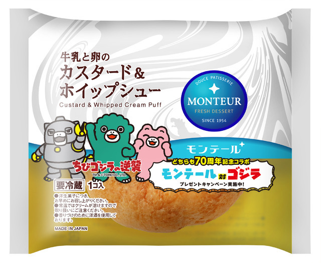 本企画では、モンテールの定番スイーツ「牛乳と卵のカスタード&ホイップシュー」「牛乳と卵のシュークリーム」「牛乳と卵のエクレア」のパッケージにゴジラをはじめとした怪獣、そしてちびゴジラをデザイン。登場するのは、世代ごとに進化してきたゴジラ、キングギドラやモスラなどシリーズ屈指の人気怪獣や、ちび怪獣たちのかわいらしい姿が共感を呼び、子どもや親を中心に人気のちびゴジラたち。世代を超えて楽しめるよう、全部で9種類のデザインにしているとのこと。