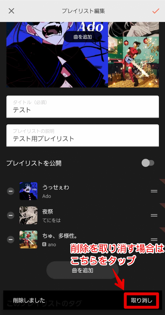 誤って削除してしまった場合は、画面下に表示される「取り消し」をタップしましょう。