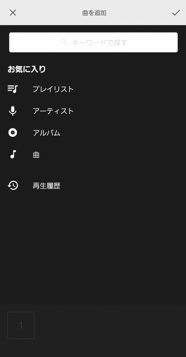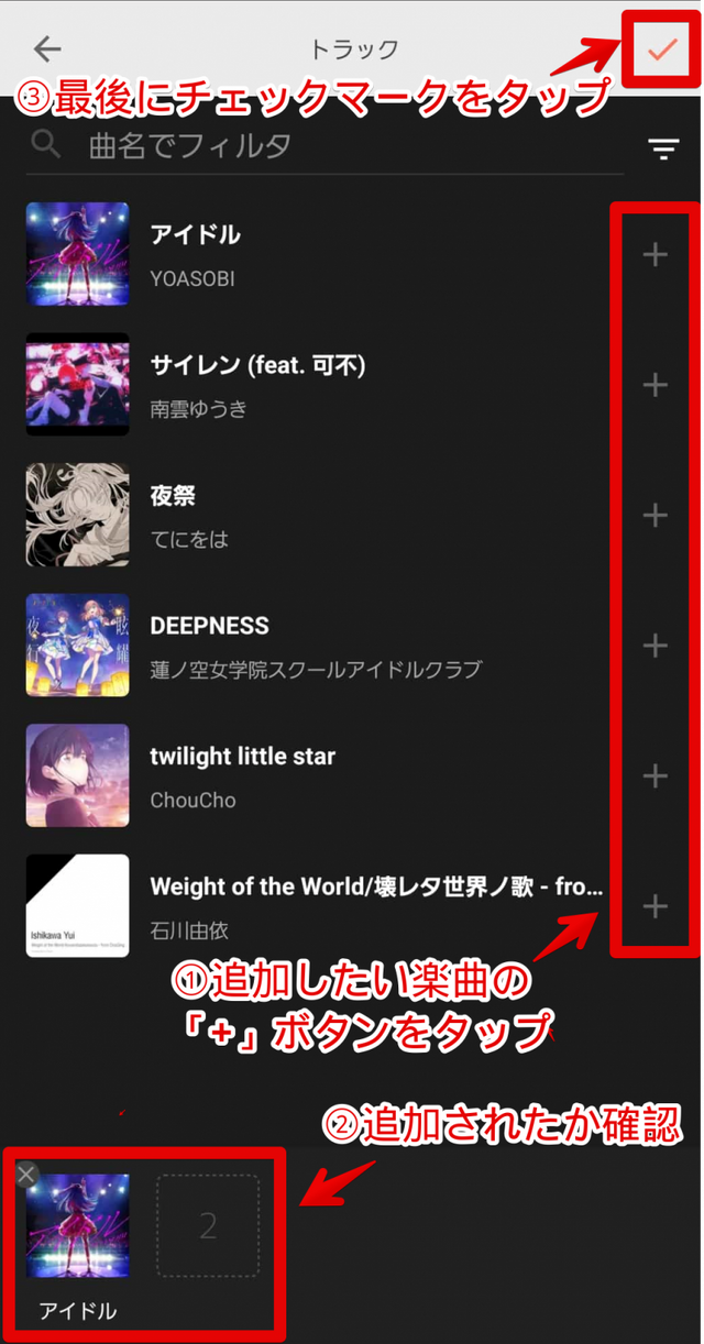 楽曲の選択を終えたら、画面右上のチェックマークをタップします。