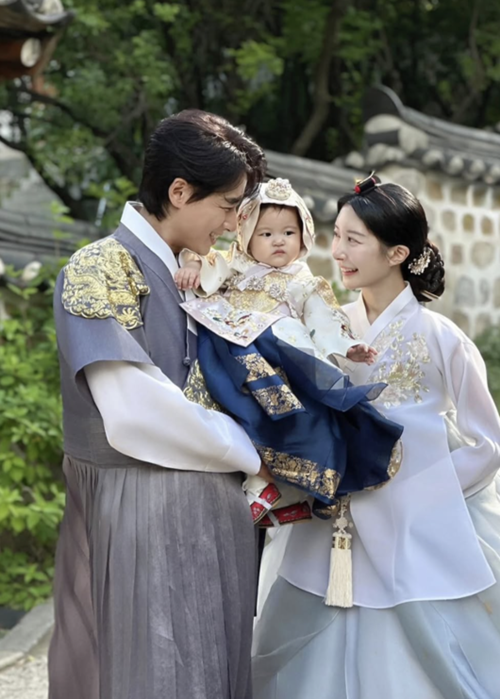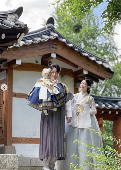 公開された写真には、韓屋を背景に韓服を美しく着こなした家族の姿が収められている。美しい刺繍と深みのある色合いが際立つ伝統的な韓服を着たルヒを中心に、イ・ジフンと彩音さんは笑顔で娘を見つめ、温かな雰囲気を醸し出している。