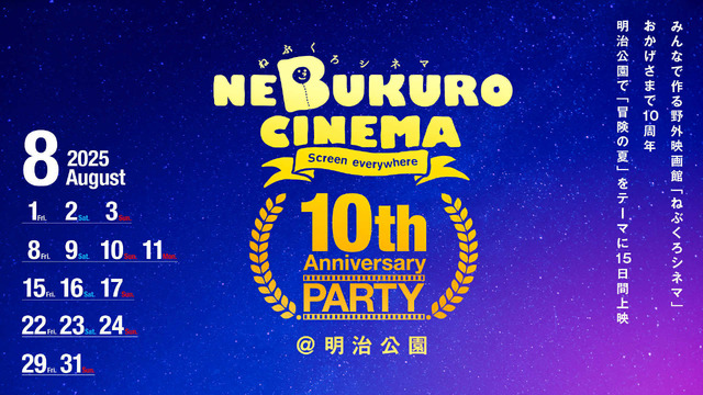 野外映画イベント「ねぶくろシネマ」の10周年記念として、『最強のふたり』、『ミニオンズ フィーバー』、『マイ・インターン』、『トップガン マーヴェリック』などを上映予定。