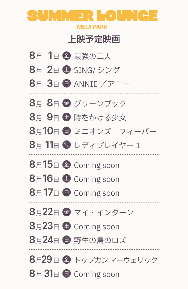 ※雨天・荒天の場合はパークシネマは中止、中止日の映画タイトルの別日再上映はございません