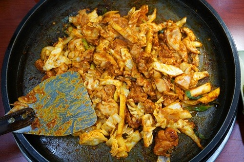 その春川が発祥の地と言われているのが、「タッカルビ(鶏カルビ)」。もともと炭火で焼いた鶏肉料理がはじまりだが、1970年代に「鶏プルコギ」を出す店が人気を集め、次第に「タッカルビ」と呼ばれるようになったと言われている。