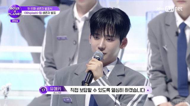世界最高レベルのグローバルボーイズオーディション番組「BOYS II PLANET」第5話にて、“第1回生存者発表式”が放送。過去に“デビュー白紙”を経験したイ・サンウォンが、170か国で投票数1位を獲得し1位に。日本人練習生はユメキが17位、マサトが8位ほか2名の計4名が次のステージに進む48名に残った。