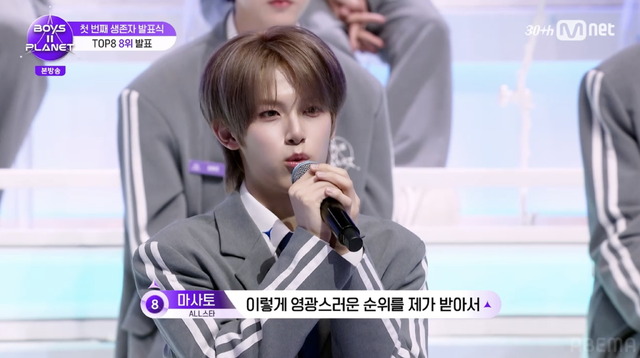 緊張が高まる中で、次々と生存者が明かされていき、日本人練習生は38位にタツキ、26位にセン、17位にユメキ、そしてTOP8の8位にはマサトがランクインした。