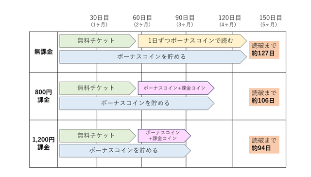 無課金の場合と1,200円を課金した場合では、読破まで約1ヶ月以上の短縮が可能です。