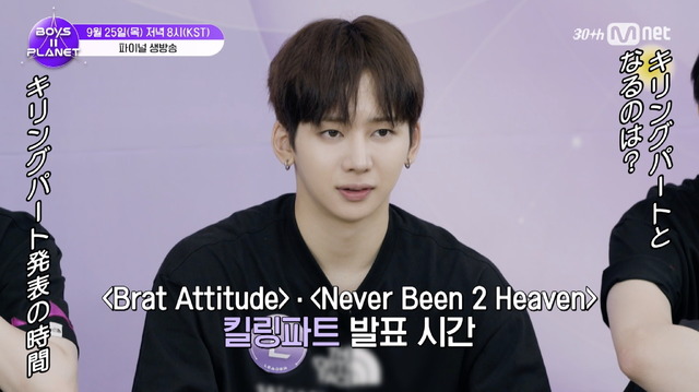 このファイナルミッションでは新曲の「Brat Attitude」と「Never Been 2 Heaven」を披露。キリングパートは、まず練習生同士の評価により候補者を2人に絞り、その中からスタークリエイター(視聴者)の投票によって決定される。
