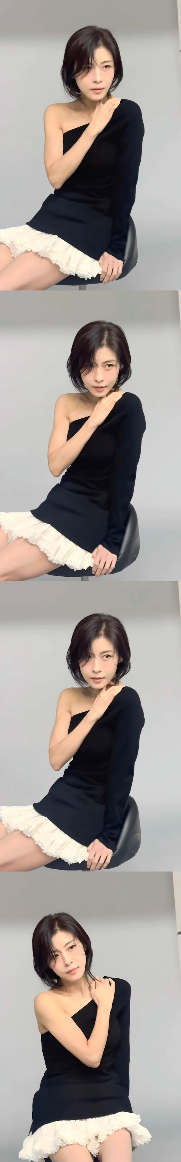 片方の肩を大胆に見せる黒のトップスに身を包み、撮影に臨むハ・ジウォン。豊かなフリルがあしらわれたスカートの下からは引き締まった太ももがのぞき、無駄のない完璧なスタイルを際立たせている。