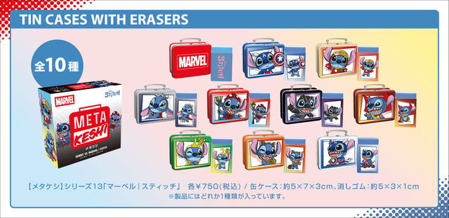ホットトイズのフラッグシップ・ストア「トイサピエンス」のオリジナル企画、缶ケースと消しゴムをセットした「メタケシ」シリーズに、「マーベル|スティッチ」が登場。ラインアップは全10種。缶ケースは、小物入れとしても使用することができ、普段使いしやすいステーショナリーとなっている。パッケージは、中に何が入っているか分からないワクワク感が楽しめるブラインドボックス仕様だ。