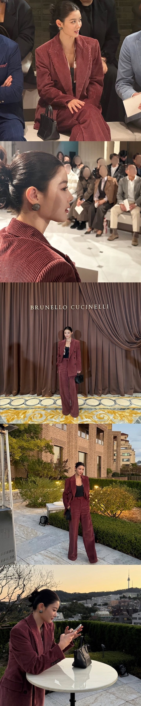 コーデュロイ素材のワインレット色のスーツを着こなしたキム・ユジョンは、秋らしい装いで落ち着いた雰囲気を演出。オールバックのヘアスタイルも相まって、大人女性の凛とした魅力を感じさせた。