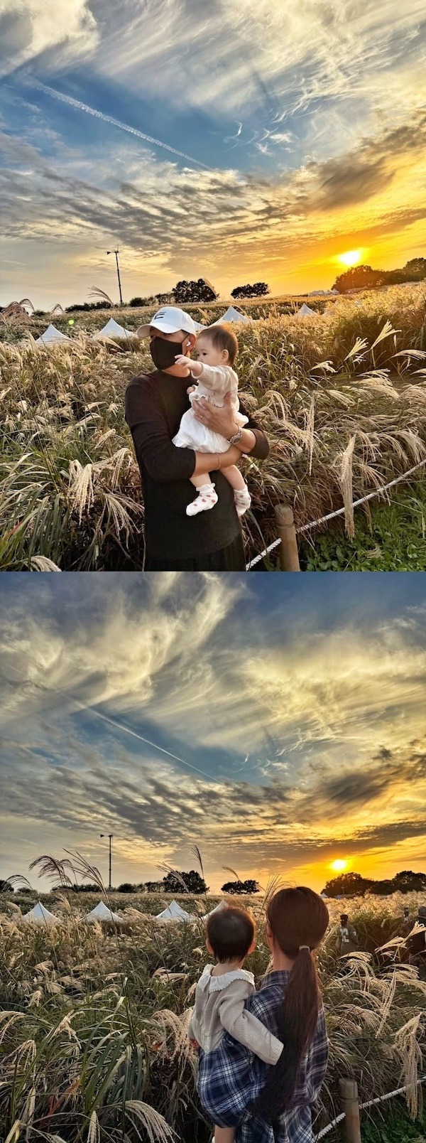 公開された写真には、ススキ野原を背景に幼い娘を抱っこしたリュ・シウォンの姿が写っている。帽子とマスクで顔を隠しながらも、娘を見つめる優しいまなざしが印象的だ。夕焼けに染まる空とススキ野原が調和し、温かな家族の雰囲気を完成させている。