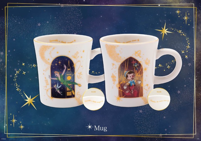 星が輝く夜のワンシーンを、そのまま手のひらサイズのキーホルダーにした「アクリルキーホルダー」、物語のキャラクターやモチーフを星座のように散りばめた「ステッカー」、『ピーター・パン』と『ピノキオ』の物語を映した「マグカップ」、『シンデレラ』の「ハンカチ」、癒やしのアイテム「ブランケット&トートバッグセット」といった、5種類のアイテムが登場。