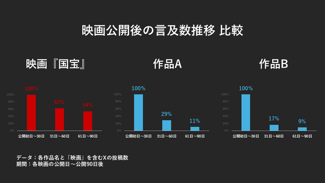 また映画『国宝』に加え、2024・2025年に公開された邦画実写の映画の中から、興行収入50億円以上の作品を任意に選定し、公開後3か月(30日、60日、90日後)の言及数の変化率を調べた。