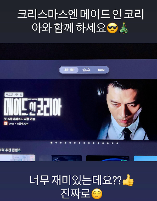 その写真には、Disney+のメイン画面に表示された『メイド・イン・コリア』のバナーが写っている。24日より配信開始された同作にはヒョンビンが主演しており、ソン・イェジンは公開直後に視聴した模様だ。