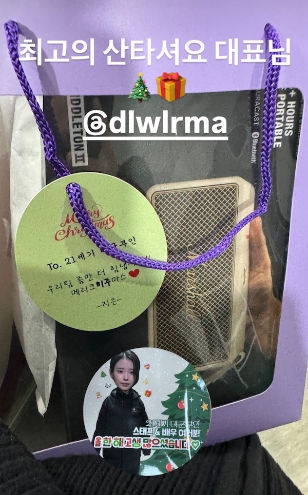 12月24日、女優イ・ヨンは自身のインスタグラムに「最高のサンタさんです、代表」とつづり、IUのアカウントをタグ付けして1枚の写真を公開。その写真には、M社のスピーカーが包装されたショッピングバッグが写っていた。