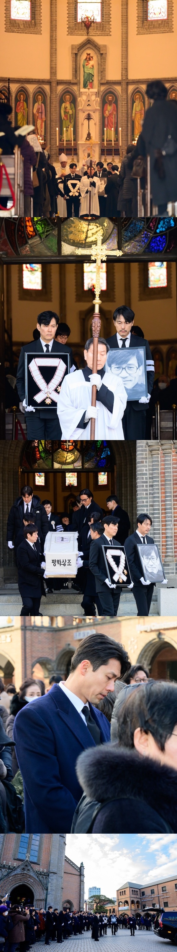 告別式は生前、敬虔なカトリック信者だった故人の意思をたたえる形で行われ、俳優のチョン・ウソンと、共同葬儀委員長を務めるペ・チャンホ監督が追悼の言葉を捧げた。
