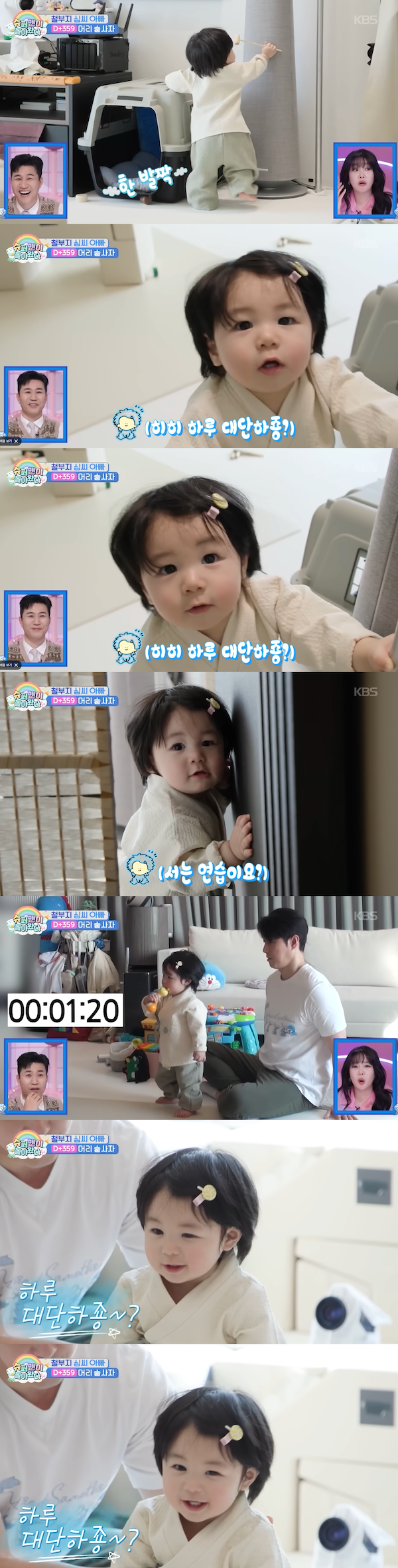 まもなく1歳の誕生日を迎えるハルくんは、すくすくと成長中。シム・ヒョンタクは「最近、壁につかまりながら一歩ずつ歩くようになった」と近況を伝えた。さらに、ハルくんが自分の力で立てるように見守ると、およそ10秒ほど自力で立ち続け、シム・ヒョンタクを喜ばせた。