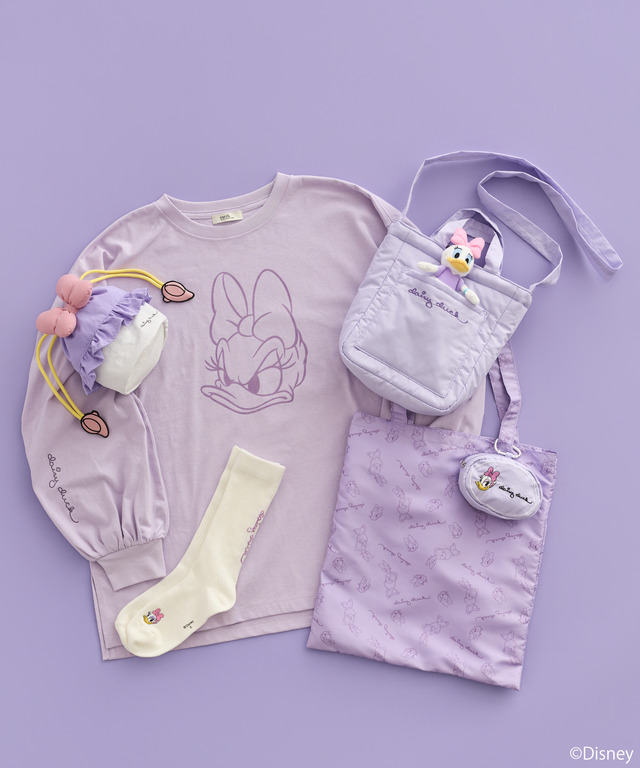 お茶目な表情をフロッキープリントしたロンTと刺繍入りソックス、ポーチ付きの総柄エコバッグ、大切なぬいぐるみをキュートに収納することができる、レトロ感のあるキャラクターアートをプリントしたミニショルダーバッグ、後ろ姿をイメージした巾着ポーチと、デイリー使いにぴったりなカジュアルアイテム5型を展開。