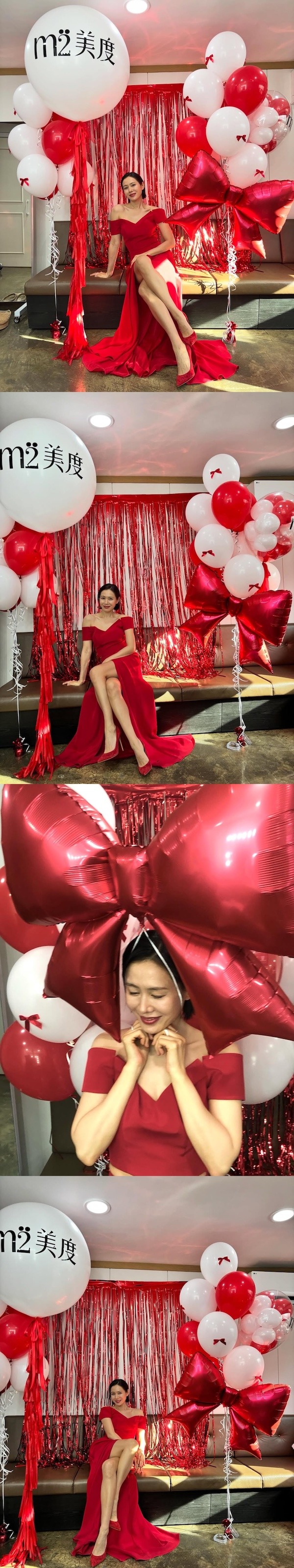特に、深く入ったスリットから伸びる美脚は、まさに「息を呑む」という表現がふさわしい。周囲に飾られた赤と白のバルーンやリボンのオブジェと相まって、まるで一流ファッション誌の撮影カットのような完成度を見せている。タイトにまとめたヘアスタイルと引き算のメイクが、彼女の持つ高級感をさらに引き立てた。