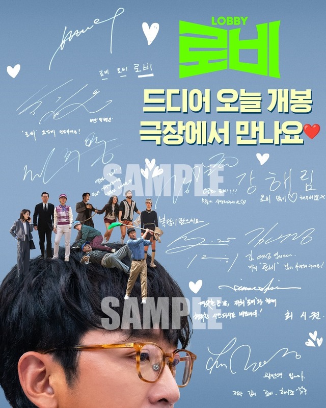 ポストカードは、ゴルフ場のグリーンに見立てたハ・ジョンウの頭部に本作を彩る、にぎやかな登場人物らが乗ったデザイン。右上に韓国語で「ついに今日公開 劇場で会いましょう」という意味のメッセージ、そのほかキャストらからのコメント&サインがプリントされており、キャストらが書いたハートマークも散りばめられた、愛のこもった1枚だ。