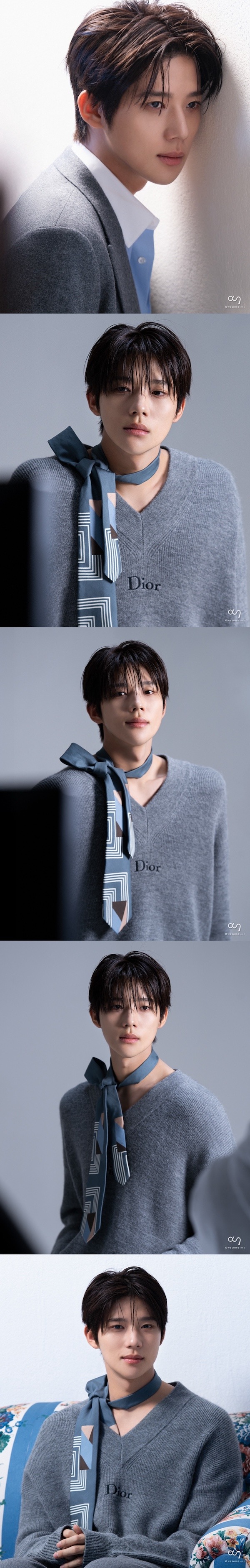 また別のビハインドカットでは、グレートーンのニットにスカーフを合わせたスタイリングで、落ち着きのある洗練されたイメージを描き出した。柔らかく落ちるニットの質感と、首のラインに沿って流れるスカーフのディテールが調和し、ミニマルなスタイルにポイントを持たせている。過剰な演出がない中でも自然と注目を集める、彼の繊細な表現力が際立っていた。