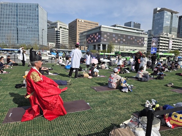今回会場となった光化門広場(六曹広場)は、韓国を代表するランドマークであり、国家行事や大規模イベントも行われる。1カ月前にはBTSのカムバックステージが行われた、まさにそのステージがあった場所だ。そこにヨガマットが敷かれ、参加者は90分間ただ座り、“ぼーっとする状態”を維持する。審査は心拍数の安定度と観客投票で行われ、会話やスマートフォンの使用は禁止、居眠りも失格となる。