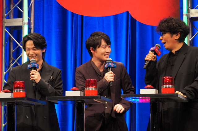 映画『君のクイズ』完成披露試写会が4月20日(月)、東京・イイノホールにて行われ、出演する中村倫也、神木隆之介、ユースケ・サンタマリアらが登壇した。早押しクイズに挑戦する段では、中村&神木、さらにはVTR出演のムロツヨシが互いの共演について熱く語る場面があり、観客から拍手が送られていた。