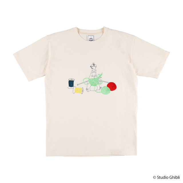 ムスカが飛行石を使用し、石板でラピュタ城を操るシーンをデザインし、暗闇でぼんやりと光るようすを楽しめるギミック付きの一枚をはじめ、黒猫のジジにそっくりなぬいぐるみをデザインしたTシャツ、タヌキたちが掲げる標語「化学復興 人間研究」がポイントのTシャツ。