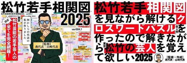 どうも、何かしらの代表をしていそうな男、燕代表の山崎代表です。この度、『松竹芸能東京若手相関図&クロスワードパズル』が全国でお買い求めいただけるようになりました。もともとは新しく入った若手芸人が先輩との話のきっかけに使えるようにと作ったものでしたが、私の会員(松竹ファン)の方々から商品化の声をいただき、ついに実現しました。推しを探すも良し、相関図を肴に飲むも良し、相関図とクロスワードパズルを通して松竹芸人をもっと知っていただければ幸いです。お笑いライブ会場で、いやセミナー会場でお待ちしております。